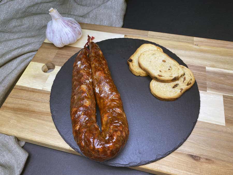 Chorizo rojo curado elaborado con ajos, pimienta roja dulce y especies. Elaborado artesanalmente.