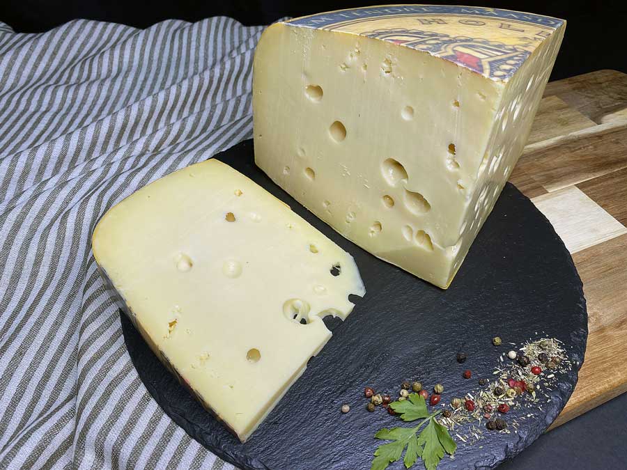 El queso Maasdammer se elabora a partir de leche pasteurizada de vaca. Es un queso de origen holandés creado como alternativa del Emmental suizo.