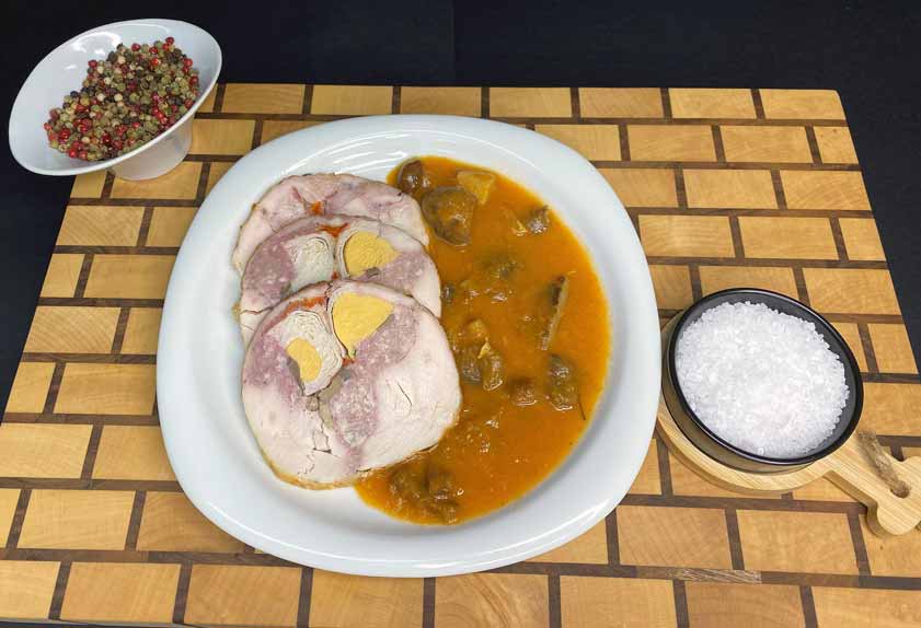 Pollo relleno con huevo duro, picada de cerdo, pimiento rojo escalivado, champiñones y panceta curada PARÍS, cocinado en el horno y acompañado de una salsa de manzana y puerro con guarnición de ciruelas y mezcla de setas. Ideal para días festivos y de celebración. Elaborado artesanalmente.