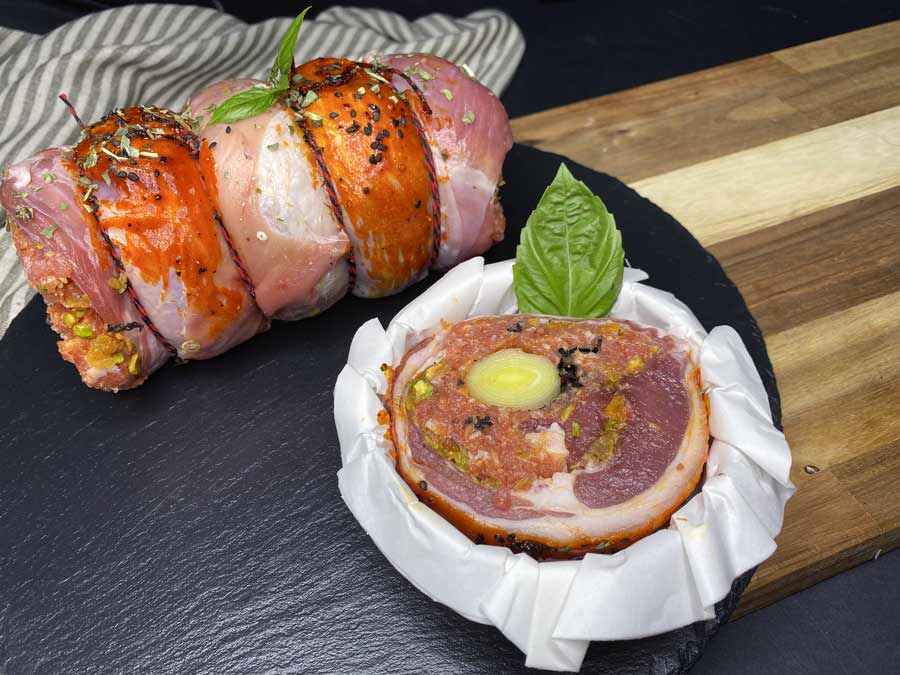 INGREDIENTES: Riñonada cordero, puerro, orejones, pistachos, almendras, trompetas de la muerte, picada cerdo y especies.