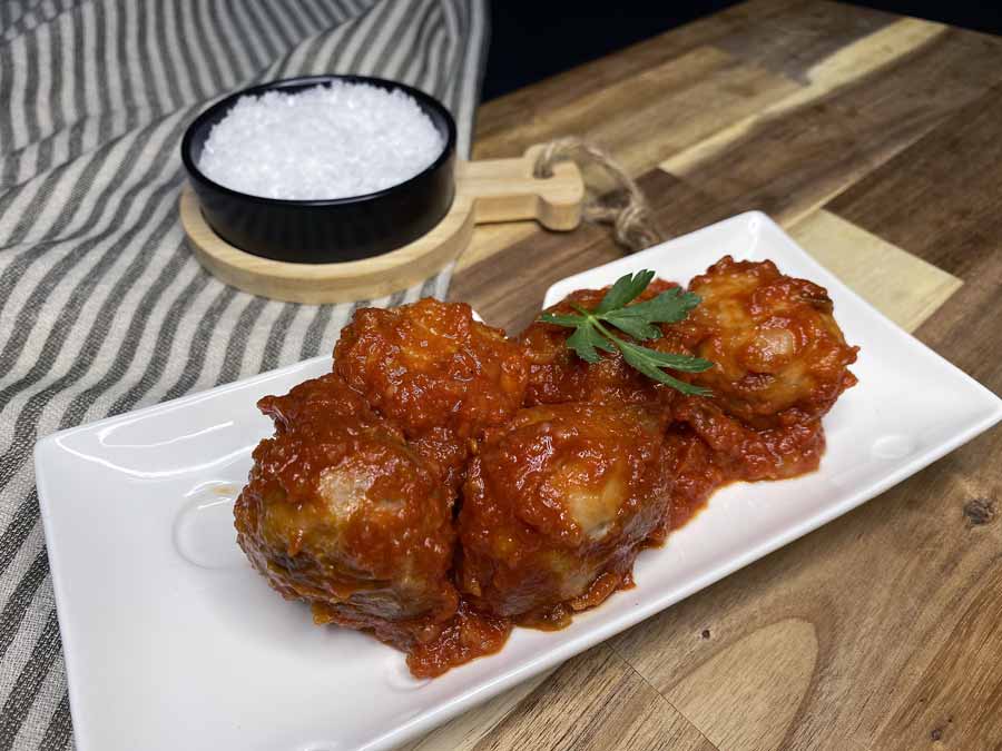 Albóndigas de carne picada de pollo y cerdo con un toque de ajo y perejil, acompañadas de un sofrito de tomate y cebolla. Una receta de toda la vida que no te dejará indiferente. Cada unidad contiene entre 10-11 albóndigas. Elaboradas artesanalmente.