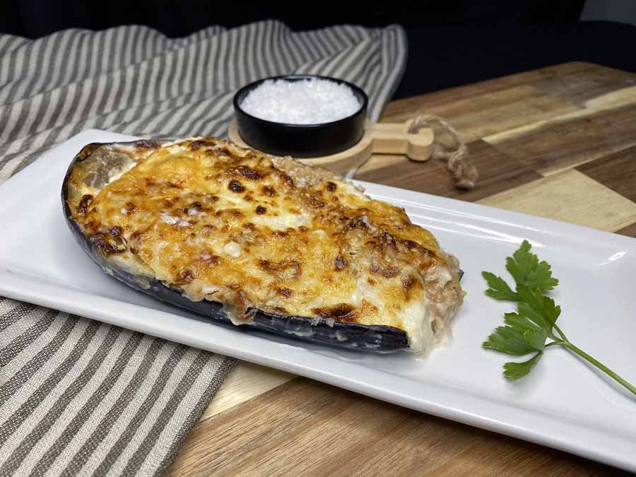 Deliciosas berenjenas rellenas de carne picada de pollo y cerdo con una cremosa bechamel y gratinada. Elaboradas artesanalmente.
