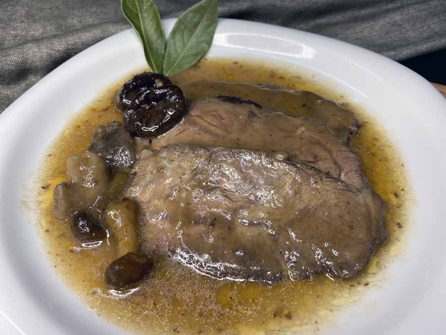 Fricandó elaborado con la receta de la abuela. Llata cocinada a baja temperatura con salsa y acompañada de setas de temporada y ciruelas. Cada unidad contiene 10 trozos, aproximadamente tres raciones. Elaborado artesanalmente.