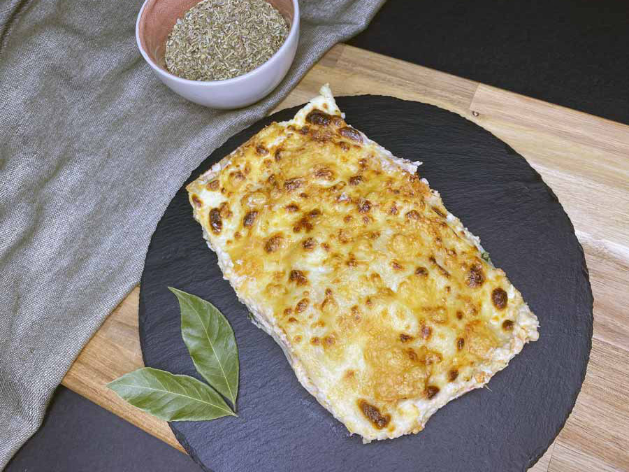 Deliciosa lasaña de carne de pollo y cerdo con sofrito de verduras, cubierta de bechamel casera y con queso gratinado. Elaborado artesanalmente.