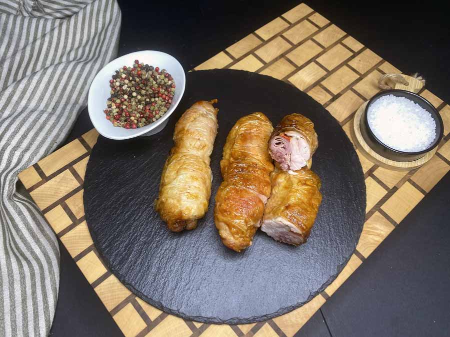 Muslos rellenos de jamón york y panceta curada PARÍS, pimiento escalivado con una salsa muy suave elaborada con manzana y puerro. Y acompañada con ciruelas y setas. Elaborado artesanalmente.