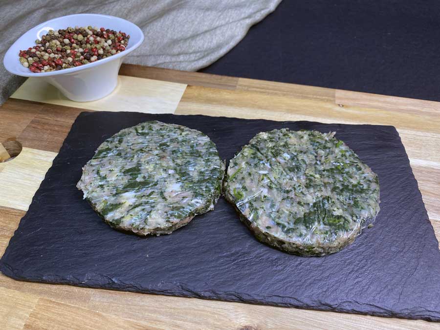Gustosa masa de pollo con espinacas. Con un sabor muy suave. Elaborado artesanalmente.